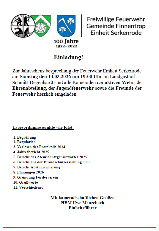 Herzliche Einladung zur Jahresdienstbesprechung der Feuerwehr Einheit Serkenrode am Samstag, 08.03.25 um 19.00 Uhr im Landgasthof Schmitt-Degenhardt.
